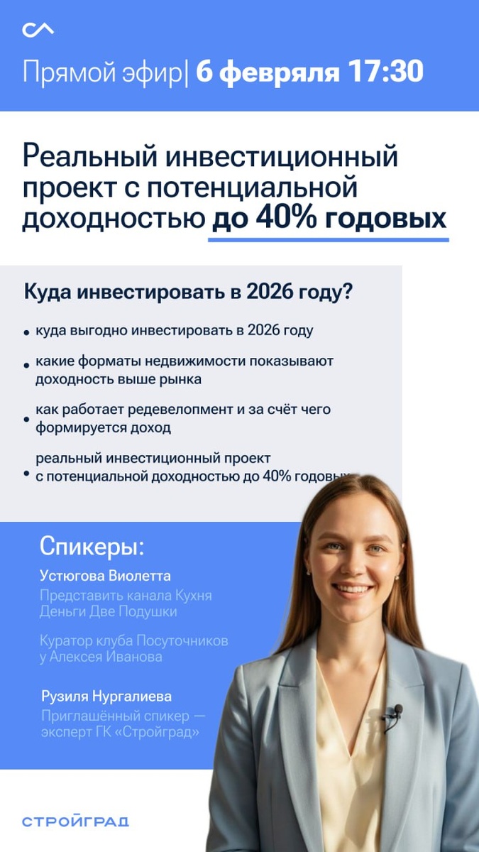 Я часто получаю вопросы: — куда сейчас выгодно инвестировать? — что будет с рынком в 2026 году? — есть ли альтернативы депозитам и классической аренде? Поэтому в пятницу в 17:30 мск наш представитель Виолетта Устюгова проведет совместный эфир с экспертом крупной редевелоперской компании «СтройГрад» 🔥 В эфире разберём: — куда реально выгодно инвестировать в 2026 году — какие форматы недвижимости показывают доходность выше рынка — как работает редевелопмент и за счёт чего формируется доход — покажем реальный инвестиционный проект с потенциальной доходностью до 40% годовых — для кого такие проекты подходят, а для кого — нет Встреча будет полезна тем, кто: — думает, куда вложить капитал — рассматривает недвижимость как инвестицию — начинающим и опытным инвесторам 🕛 Старт: в пятницу 06.02 в 17:30 Кто будет — накидайте реакций 🔥