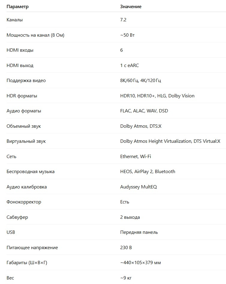 Marantz NR1711 — это тонкий 7.2‑канальный AV‑ресивер, в котором сочетаются фирменное звучание бренда и современные технологии. Он рассчитан на тех, кто собирает домашний кинотеатр без громоздкой техники. Модель выдает 50 Вт на канал при нагрузке 8 Ом. Поддерживаются конфигурации до 7.2. На борту — HDMI 2.1 с поддержкой 8K и 4K/120 Гц, HEOS, Wi-Fi, Bluetooth, AirPlay 2 и Ethernet. Воспроизводит файлы ALAC, FLAC, WAV, MP3, AAC и DSD. Высота корпуса — 10,5 см. Это вдвое ниже стандартных AV‑ресиверов. Передняя панель металлическая, оформление минималистичное. Все органы управления интуитивно понятны, в том числе через экранное меню и пульт. Ресивер справляется с 8K при 60 Гц и 4K при 120 Гц. Также возможен апскейлинг до 8K. Все актуальные видеостандарты поддерживаются: HDR10, HDR10+, HLG, Dolby Vision, Dynamic HDR. Подключение через eARC позволяет передавать несжатый звук напрямую с телевизора. Для игр реализованы ALLM, QFT и VRR. Это снижает задержки и устраняет разрывы кадров. Marantz NR