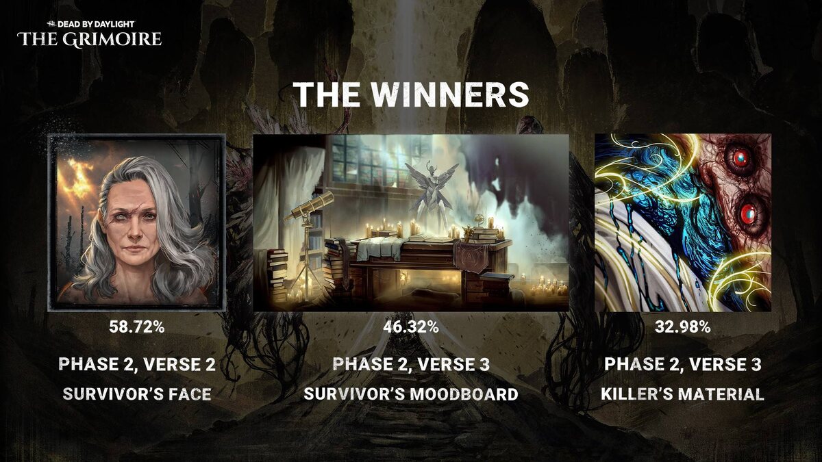 📖 Второй этап, второй стих — «Измени свою судьбу», и третий стих официально завершены, и пришло время объявить результаты! ⬇️ Напишите в комментариях, кого вы видите в роли Убийцы и Выжившего по мере того, как они начинают обретать форму. 📅 19 февраля пройдет стрим от разработчиков для сообщества, а так же вы сможете принять участие в следующем голосовании по Гримуару. 🔪 Подписаться | ⚡️Голосовать #deadbydaylight #дбд #dbd #news #dbdnews #новостидбд #гримуар #grimoire