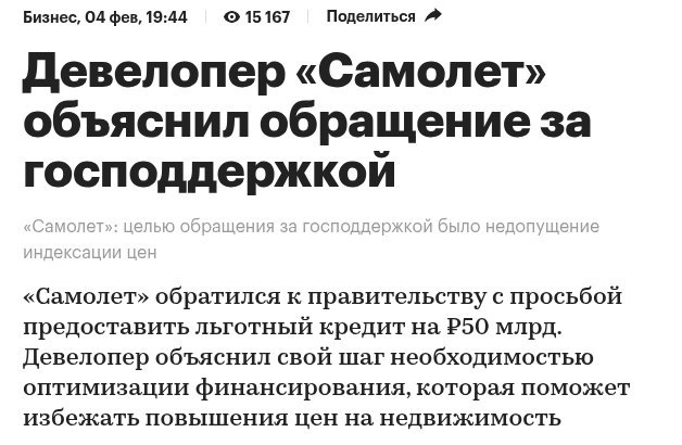 Застройщик Самолёт просит денег у государства. Не мог не прокомментировать эту новость. Логично что подобные вопросы такими обращениями не решаются. И тем более если вы госкомпания и не системообразующая, то никто вас спасать не будет. Да, банкротство такого игрока ударит по рынку недвижимости, но освободившуюся долю вскоре займут конкуренты. Неужели в Самолёте такие простые и наивные управленцы? Отнюдь. Облигации самолёта штормит уже второй год на каждой негативной новости, и ходили слухи что всё это манипуляции чтобы выкупить свои долги подешевле. До текущего момента я не верил в это. Но сейчас снова некоторые бумаги рухнули по 10% и более на этой новости. И лично я сейчас в этом вижу как раз манипуляцию рынком.