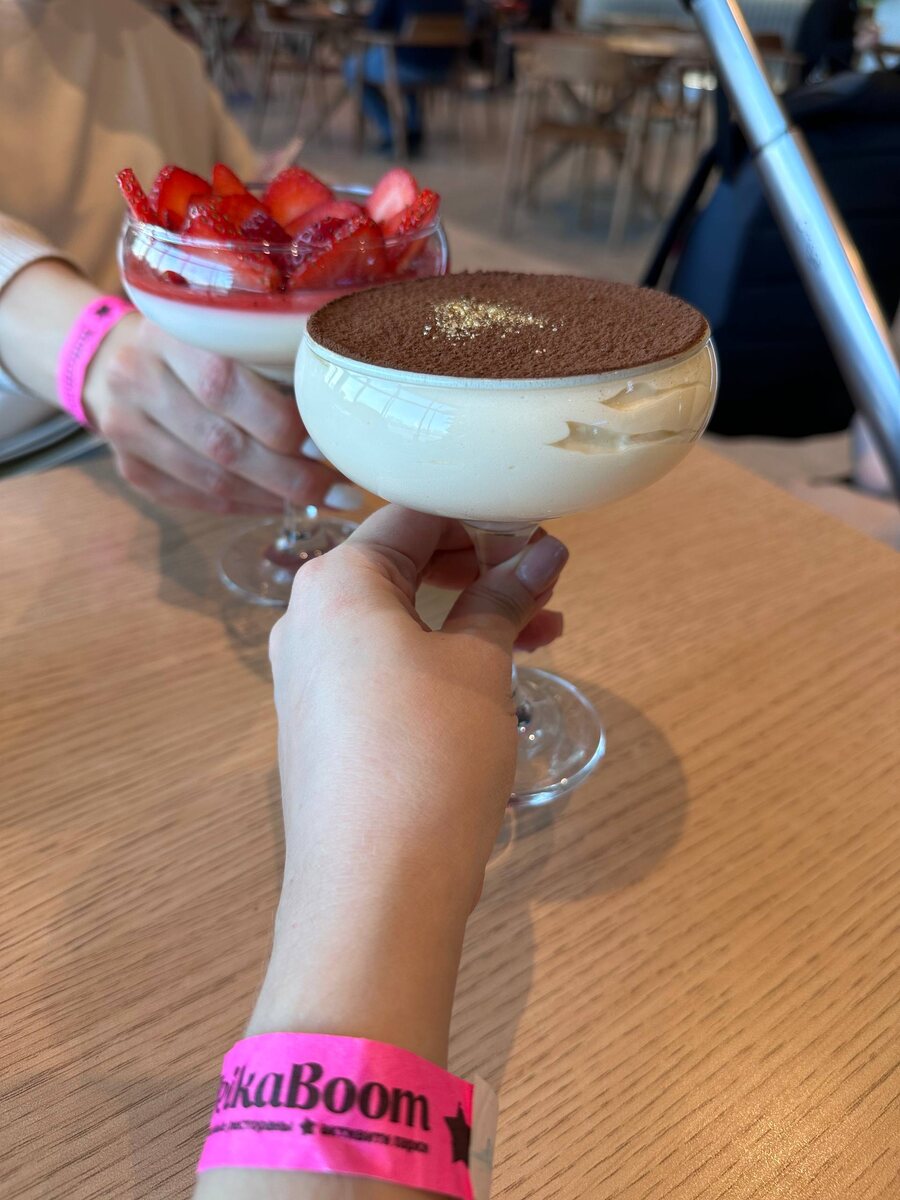 🥂 😁 Набрели на фантастически вкусные десерты - тирамису и клубничная панакотта - в невероятно красивой подаче! 😍 Разве можно устоять? А Арианна сегодня, наконец-то, впервые выгуливала свой костюмчик «Жасмин», который нам подарила соседка. Это ручная работа 😍 Он почти год ждал, пока Арианна подрастет 😁 Как ей идёт!! 🩵
