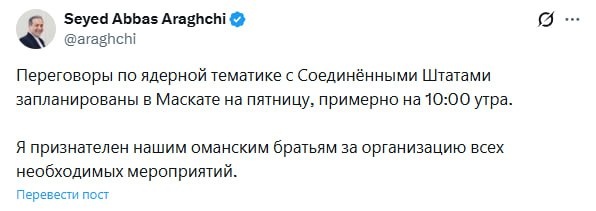 Переговоры пройдут в столице Омана Маскате, заявил он. Ранее Axios со ссылкой на американских чиновников утверждал, что переговоры Ирана и США в пятницу отменены. Источник Telegram: toporlive