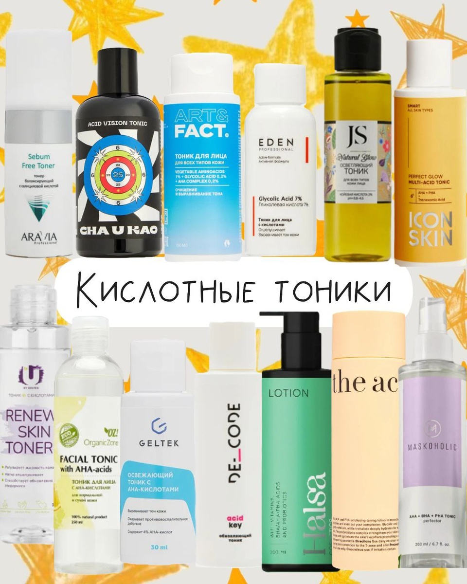 Большинство тоников на рынке это кислотные коктейли, рассчитанные на нормальную, комбинированную, жирную и возрастную кожу. Ниже рассказала кто есть кто и кому что подойдёт • The U Базовый рабочий AHA-тоник на молочной и гликолевой кислотах + аргинином и пантенолом для комфорта. Хорош для нормальной, комбинированной и жирной кожи без чувствительности • Organic Zone Фруктовые кислоты + гиалуроновая кислота, пантенол и аллантоин. Цитрусовые экстракты могут повышать чувствительность, поэтому только вечер и только для нечувствительной кожи • Art&Fact Много кислот, но ещё больше заботы о барьере: сквалан, мочевина, аминокислоты, алоэ. Отличный вариант для сухой, обезвоженной и возрастной кожи, которой нужно обновление без пересушивания • Гельтек Настоящий кислотный коктейль: AHA + BHA + витамин C. Рабочий вариант для жирной, проблемной и комбинированной кожи с чёрными точками и неровной поверхностью • Decode Гликолевая кислота для эффекта, PHA для мягкости, миндальная кислота и солодка