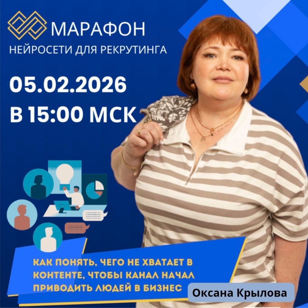 🏆 НЕЙРОСЕТИ ДЛЯ РЕКРУТИНГА ▪️▪️▪️▪️▪️▪️▪️▪️▪️ 📆 05.02.2026 ⏰ 15:00 МСК ▪️▪️▪️▪️▪️▪️▪️▪️▪️ ➖ ТЕМА: "КАК ПОНЯТЬ, ЧЕГО НЕ ХВАТАЕТ В КОНТЕНТЕ" чтобы канал начал приводить людей в бизнес 🎙️ СПИКЕР 🎙️ ОКСАНА КРЫЛОВА ▪️▪️▪️▪️▪️▪️▪️▪️▪️ Знакомо? - контент есть, а заявок нет - просмотры идут, но в личку не пишут - кажется, что «чего-то не хватает», но непонятно - чего именно ✅ На этой встрече мы разложим всё по полочкам. Что будет на разборе: ✅ ключевые ошибки, из-за которых контент не продаёт ✅ как понять, на каком этапе «теряется» человек ✅ какие элементы должны быть в канале, чтобы он вёл в бизнес ✅ как перестать стрелять вслепую и начать действовать осознанно ✅ Без воды. Чётко, по делу и с пониманием,что менять уже сейчас. ❔ Формат: онлайн Ссылка на ЗУМ будет в чате за 15 минут до начала 📍 Приходи, если хочешь, чтобы твой контент работал на тебя, а не просто «был» ✨