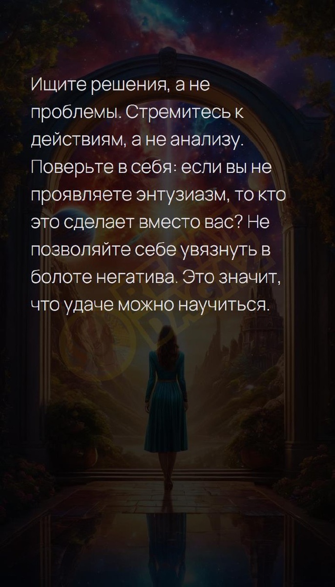 Стремитесь к действиям, а не анал... Ищите решения, а не проблемы. Стремитесь к действиям, а не анализу. Поверьте в себя: если вы не проявляете энтузиазм, то кто это сделает вместо вас? Не позволяйте себе увязнуть в болоте негатива. Это значит, что удаче можно научиться. Архитектура вашей души | Натальная карта T | VK | Pin | YouTub | Dzen #успех #ямогу #день #аффирмациядня #светлыйпуть #новаяжизнь #счастливаясемья #магияжизни #яесть #5число #5февраля