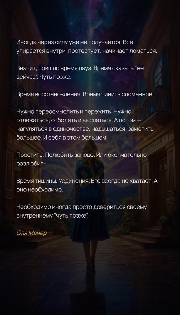 Всё упирается внутри, прот... Иногда через силу уже не получается. Всё упирается внутри, протестует, начинает ломаться. Значит, пришло время пауз. Время сказать "не сейчас". Чуть позже. Время восстановления. Время чинить сломанное. Нужно переосмыслить и пережить. Нужно отлежаться, отболеть и выспаться. А потом — нагуляться в одиночестве, надышаться, заметить большее. И себя в этом большем. Простить. Полюбить заново. Или окончательно разлюбить. Время тишины. Уединения. Его всегда не хватает. А оно необходимо. Необходимо иногда просто довериться своему внутреннему "чуть позже". Оля Майер Архитектура вашей души | Ваш Ангел и Демон T | VK | Pin | YouTub | Dzen #исцеление #любовьктелу #благополучие #день #эволюция #полезно #подсказка #секретуспеха #процветай #5число #5февраля
