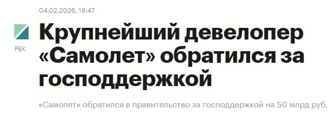 За это готовы предоставить блокпакет акций для участия в управлении с правом выкупа С учетом корректировки программы льготной ипотеки для исключения невыполнения обязательств перед дольщиками и инвесторами, просим рассмотреть в качестве меры поддержки возможность выделения компании льготного кредита или другого стабилизационного инструмента в объеме 50 млрд руб. на срок до трех лет Уж не в преддверии выплат неустоек, ребята стелят соломку 🤔 @iliilitop