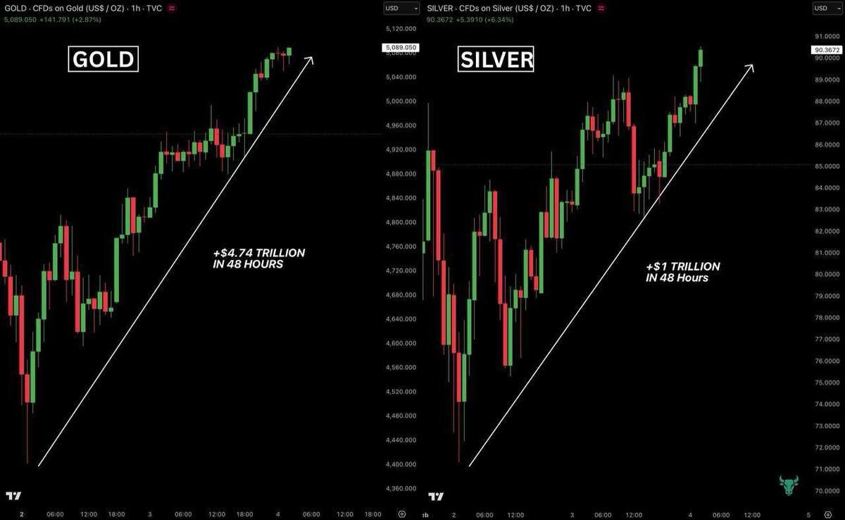 Привет, друзья! Сегодня рынок драгметаллов преподнёс нам впечатляющие цифры: золото вновь выросло выше 5000 долларов за унцию, прибавив 17%. Это не просто цифры на экране — это мощный сигнал для инвесторов и всех, кто следит за экономическими тенденциями. За 48 часов рыночная капитализация золота увеличилась на 4,74 триллиона долларов. Серебро тоже не отставало: прибавив 26%, оно увеличило свою капитализацию на 1 триллион долларов за тот же период. Всего за два дня рынок обогатился почти на 6 триллионов долларов. Что это значит для нас, обычных людей? Золото и серебро традиционно считаются «тихой гаванью» в периоды экономической нестабильности. Рост цен на драгметаллы может означать, что инвесторы ищут надёжные активы, стремясь защитить свои средства от возможных потрясений. Это также может повлиять на стоимость ювелирных изделий и других товаров, содержащих драгоценные металлы. Однако не стоит забывать, что инвестиции в драгметаллы связаны с рисками. Резкие колебания цен могут привест