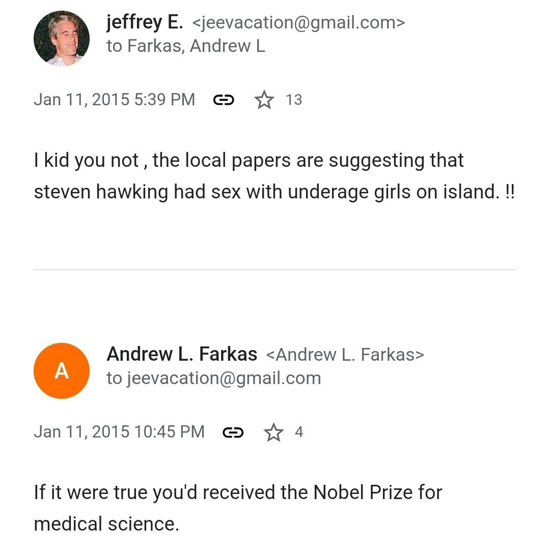 'If it were true you'd received Nobel Prize for medical science' Epstein and real estate mogul Andrew Farkas JOKE about papers reporting Steven Hawking 'had sex with underage girls on island'