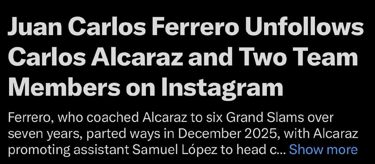 💔💔💔 Хуан Карлос Ферреро отписался от Карлоса Алькараса и двух членов команды в Инстаграме. Ферреро, тренировавший Алькараса на протяжении семи лет и шести турниров Большого шлема, расстался с ним в декабре 2025 года, после чего Алькарас повысил ассистента Самуэля Лопеса до должности главного... Подпишись на Эйс и точка