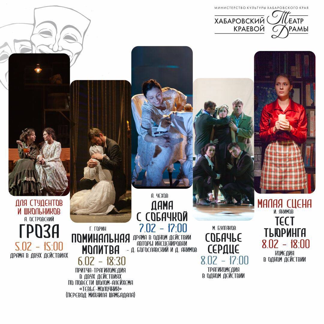 ✔ «Гроза» А. Островского — драма в двух действиях, 12+ (#5_февраля, 15:00) ✔ «Поминальная молитва» Г. Горина — притча-трагикомедия, премьера, 16+ (#6_февраля, 18:30) ✔ «Дама с собачкой» по А. Чехову — драма в одном действии, премьера, 18+ (#7_февраля, 17:00) ✔ «Проводы жизни» — трагикомедия учебного театра ХГИК, малая сцена, 16+ (#7_февраля, 18:00) ✔ «Собачье сердце» М. Булгакова — трагикомедия, 16+ (#8_февраля, 17:00) ✔ «Тест Тьюринга» И. Якимова — комедия, малая сцена, 16+ (#8_февраля, 18:00) 📅 Когда: #5_февраля — #8_февраля ⛳ Где: ул. Муравьева-Амурского, 25 💳 Стоимость: 350–1500 ₽ Билеты 👉 Афиша Хабаровска. Куда сходить, экскурсии