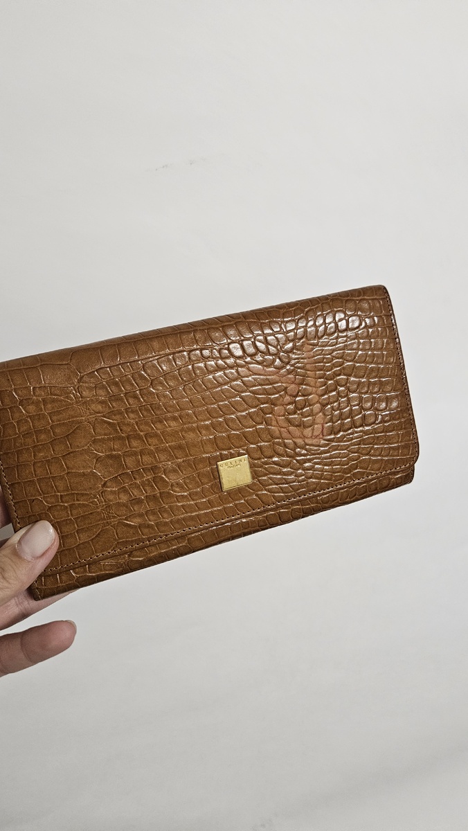 Элегантный кошелёк Celine Paris выполнен из коричневой кожи с тиснением под крокодила. Имеет лаконичный дизайн с двумя металлическими кнопками-защёлками. Внутренняя часть — из гладкой кожи, с тиснением «Celine Paris». Компактный, но функциональный аксессуар, сочетающий стиль и практичность. Был приоберетен в Тайданде.