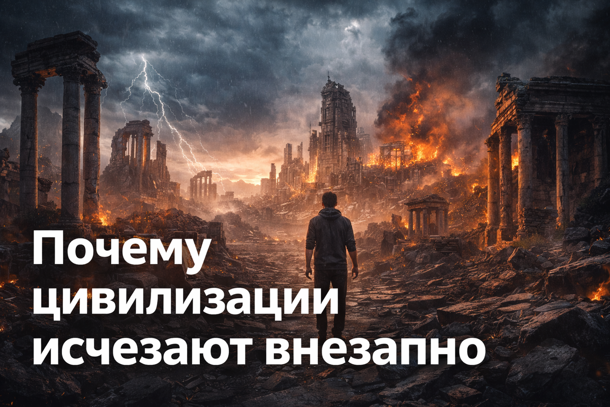 почему многие цивилизации исчезали не постепенно, а почти мгновенно? Города пустели за одно-два поколения. Торговля обрывалась. Письменность забывалась. Технологии исчезали. И это происходило даже с теми обществами, которые казались устойчивыми и развитыми. Разберёмся, почему цивилизации рушатся резко, а не медленно. Любая цивилизация - это не просто города и здания. Это хрупкая система, состоящая из: Пока все элементы работают, общество выглядит стабильным.
