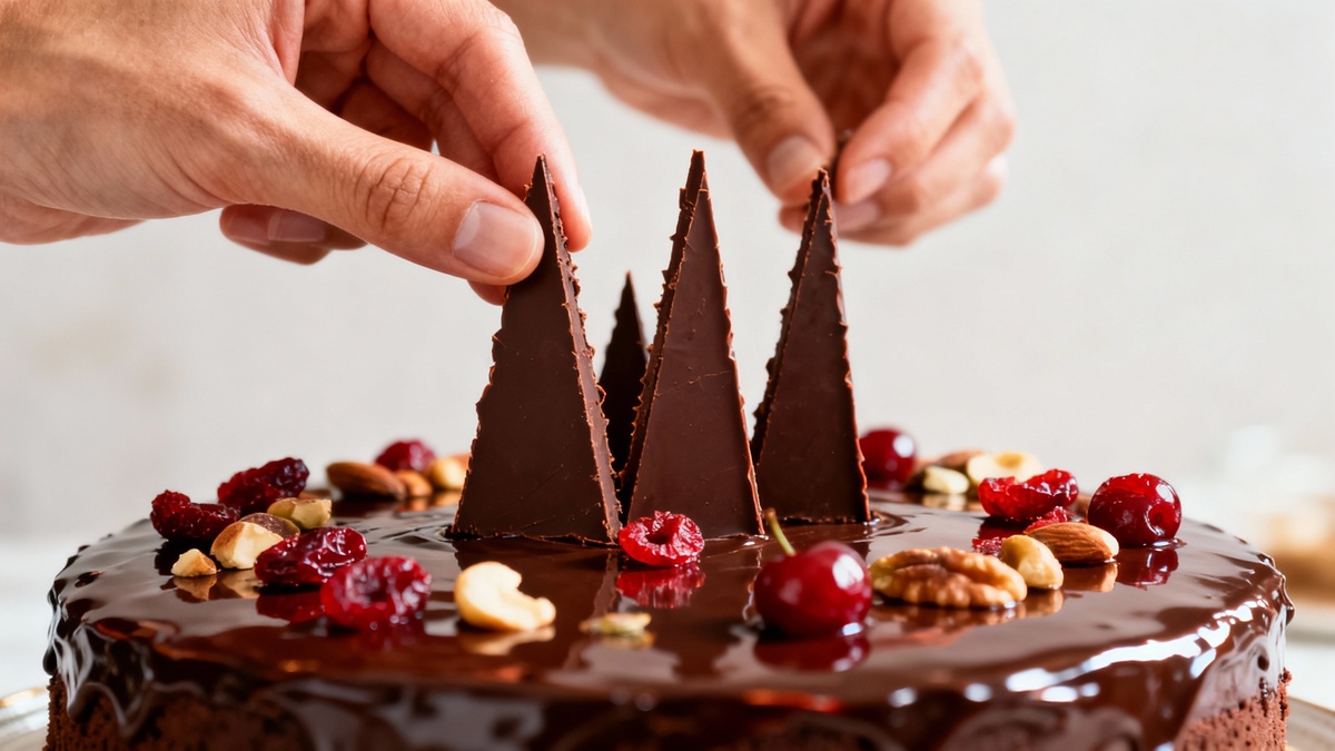 Когда шоколад застынет, но еще не станет ломким, его нарезают длинными треугольниками разной высоты. Для этого используют острый нож, который периодически смачивают в теплой воде. Получившиеся шоколадные фигуры станут настоящей изюминкой десерта: их аккуратно вдавливают в бока торта, создавая эффектную «корону». Оставшийся шоколад измельчают и посыпают сверху, чтобы завершить композицию.