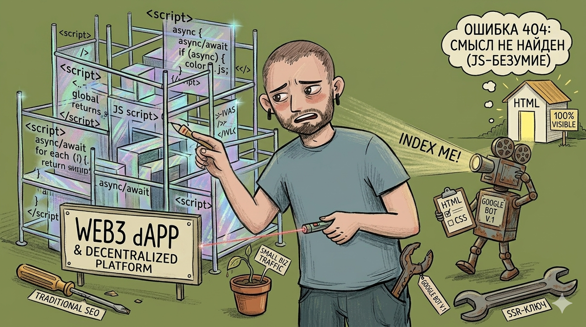Вы запускаете dApp, код идеален, смарт-контракты прошли аудит, но органического трафика – ноль. Вы открываете Google Search Console, смотрите, как робот видит ваш сайт, и обнаруживаете белый экран или вечный спиннер загрузки. Это классическая ситуация для 90% Web3-стартапов.