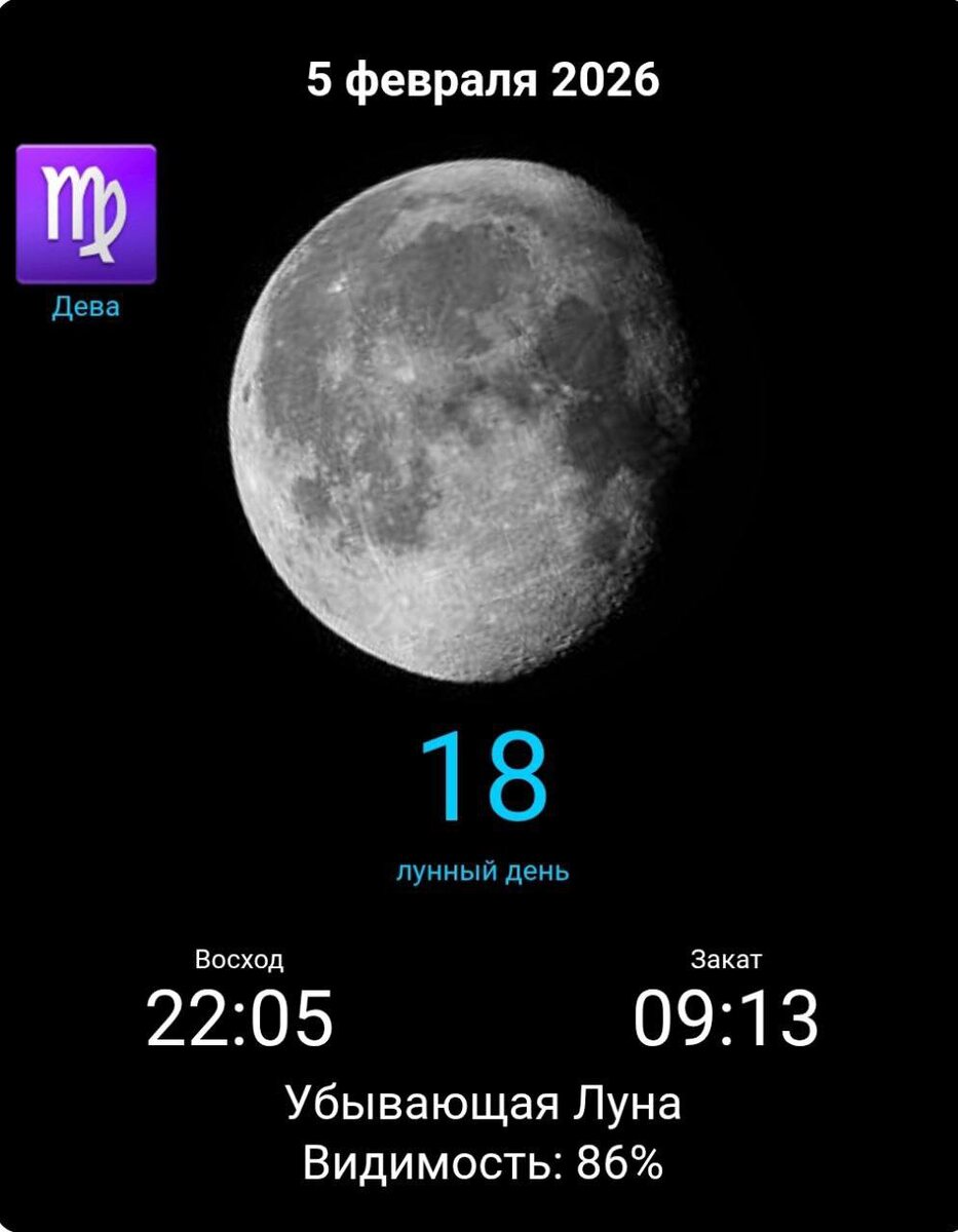 🌙 Сегодня, 5 февраля 2026 года, нас ждёт 18-й лунный день. Это время, когда Луна продолжает убывать, и её видимость составляет 86%. Восход Луны в 22:05, а закат в 09:13. 🌞 Настроение и самочувствие: В этот день может ощущаться некоторая усталость и желание уединиться. Это отличное время для отдыха и восстановления сил. Постарайтесь уделить время себе и своим увлечениям. 📌 Советы дня: 1. Отдых и релаксация: Найдите время для медитации или просто расслабьтесь с любимой книгой. 2. Здоровье: Обратите внимание на своё питание и постарайтесь включить в рацион больше свежих овощей и фруктов. 3. Творчество: Это хороший день для того, чтобы заняться творчеством или начать новый проект. 4. Общение: Хотя вам может хотеться уединения, не забывайте поддерживать связь с близкими. 🔮 Пусть этот день будет наполнен гармонией и спокойствием! 🌙💤 #ЛунныйДень #18ЛунныйДень #УбывающаяЛуна #Отдых #Релаксация
