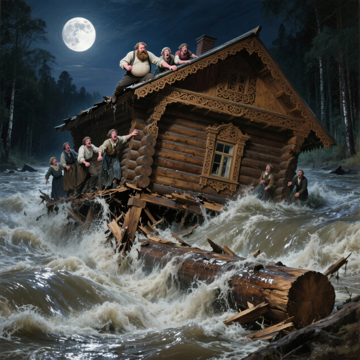 Паника охватила купца. Он бросился будить семью, прислугу. «В гору! Бегите в гору!» Но когда они выскочили во двор, было уже поздно. Вода окружила холм плотным, пульсирующим кольцом. Она не просто заливала — она размывала землю. С визгом и скрежетом новые стены дома стали давать трещины. Сараи, полные добра, амбары с зерном — всё это вода поглощала с жадным рокотом, не унося вниз по течению, а словно затягивая вглубь, под холм.