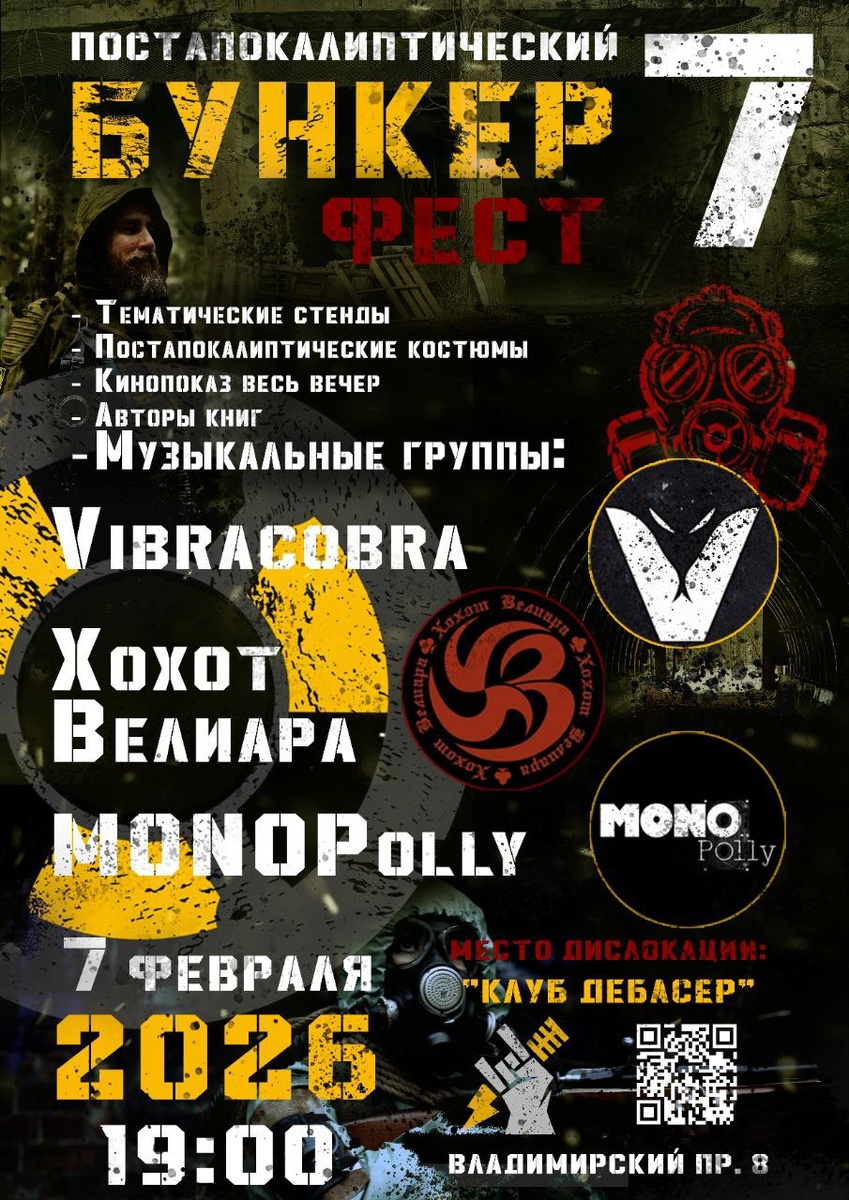 " БУНКЕР ФЕСТ 7 состоится в Санкт-Петербурге, через два года после первого мероприятия. Событие пройдёт в клубе «Дебасер». На фестивале соберутся косплееры, литературные и музыкальные коллективы, а также представители различных творческих сообществ. - Музыкальные группы: - Хохот Велиара - MONOPolly - Vibracobra - Почетные гости, блогеры и писатели: - Игорь Вардунас - Денис Килесов - Юрий Уленгов - Валерий Пылаев - Андрей Лоскутов - Тематические площадки: - Кожаные изделия от Careful Attitude - Мини-фигурки Кота Никодима - 3D-изделия от 3D-lavka BRZ - Тематические вещи от Аспида - Мир Fallout. Dead End Весь вечер будет идти закрытый кинопоказ фильма «БУНКЕР 2033». Средства от продажи билетов пойдут на создание новых серий. Адрес: Санкт-Петербург, Владимирский проспект, дом 8. Дата: 7 февраля 2026 года, суббота. Покупайте билеты на сайте, заранее дешевле, а удовольствия от общения столько же! И обратите внимание, появился билет с поддержкой фильмов пос