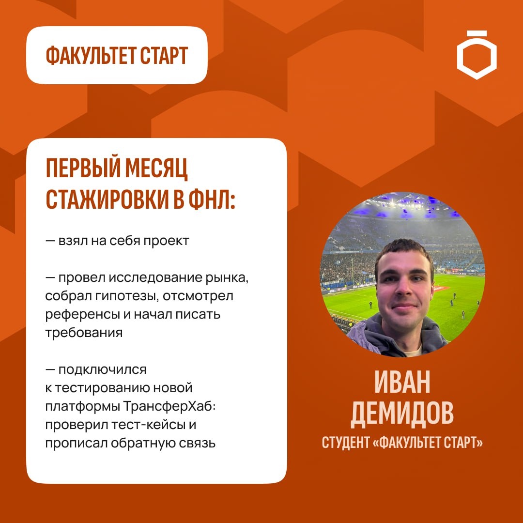 По итогам отбора на неё попал один студент «Факультет Старт» — Иван Демидов. Он выполнил тестовое задание, прошёл интервью и вышел на стажировку. За первый месяц Ваня успел: — разобраться в цифровой экосистеме ФНЛ и взять на себя один из проектов; — провести по проекту исследование рынка, собрать гипотезы, отсмотреть референсы и начать писать требования; — подключиться к тестированию новой платформы ТрансферХаб: проверить тест-кейсы и прописать обратную связь. Стажировки — это реальный старт в профессии. Студентам «Факультет Старт» доступны разные направления, от медиа и ивентов до диджитал и коммерции. Возможности появляются регулярно 😎 ➡️ Если ты тоже хочешь, чтобы спорт стал работой, а не мечтой — начинай путь с «Факультет Старт»: @fchrstart_bot 🟠 Подписаться на Факультет