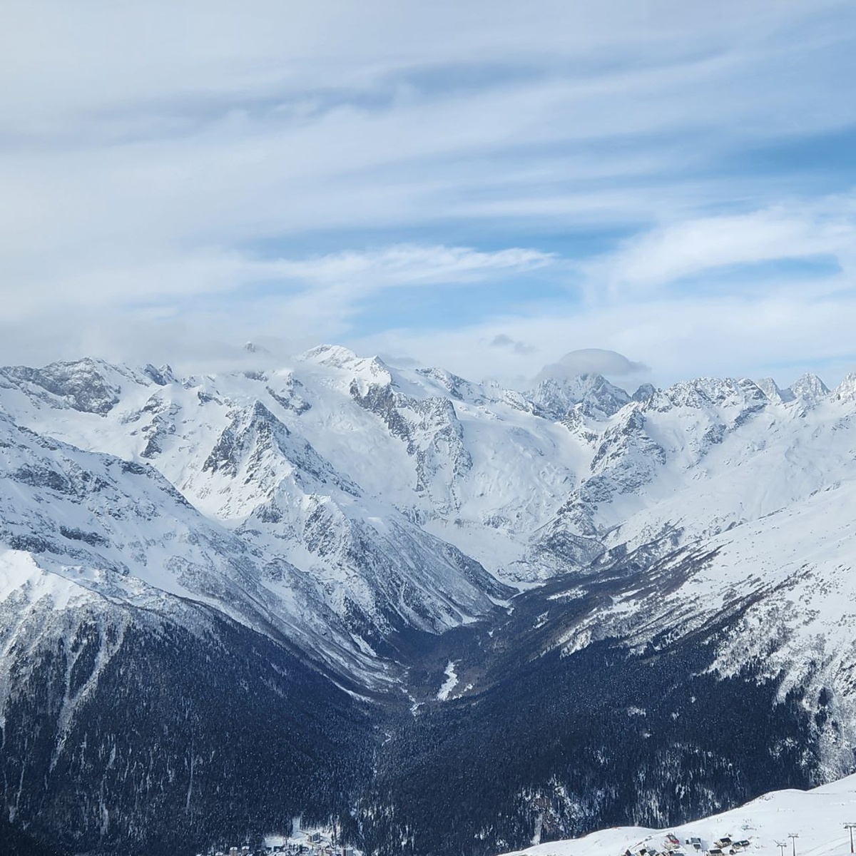 Ну, вот откатав пару дней в Архызе, оглядев окрестности, разогревшись и немного разочаровавшись в данном местечке, перебираюсь в Домбай. Сразу бросается в глаза, что этот поселок намного цивильнее – здесь не только одна центральная улица, за которой огороды. Но есть несколько улочек с более крупными гостиницами, даже есть Пятерочка и Додопицца, очень достойный ресторан Бизон. И еще из приятного – подъемник на гору в пешей доступности. Пунктов проката горнолыжного оборудования полно, ски-пасс стоит 3600 на полный день (9.00-16.00), на часть дня не предусмотрено. Первый спуск с нижней части одновременно и радует, и огорчает. Радует тем, что трасса широкая, оттраченная (чистый вельвет),плавно вьется среди соснового леса. Катишь, дышишь полной грудью – живешь!!! Но выходит трасса не к подъемнику, а к дороге, ее нужно перейти и еще идти метров 200 пешком до подъемника. Это объясняет, почему люди катаются, в основном, на верхних участках, где скатываются прямо к промежуточному подъемнику. По