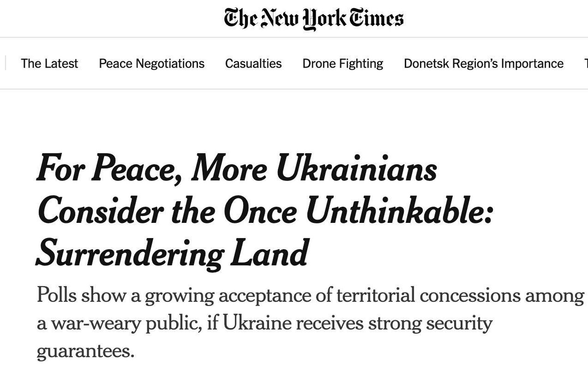 The New York Times сообщает о заметном росте числа украинцев, готовых пожертвовать Донбассом в обмен на гарантии безопасности. Если в 2022 году 82% были категорически против территориальных уступок, то сегодня уже 40% согласны на передачу Донбасса России лишь бы не воевать дальше. Это уже не абстрактные рассуждения. Жители вроде Кристины Юрченко, которая вложила всё в свою танцевальную студию, открыто говорят: «Готова отказаться от всего, лишь бы мир и без повторения кошмара». Американское издание подчёркивает: усталость от войны меняет общественное сознание. Украина стоит перед внутренним расколом 52% всё ещё против любых уступок. Но если настроение будет и дальше сдвигаться, у власти останется два варианта: игнорировать волю части общества или идти на компромиссы с Москвой под давлением и реалий, и союзников. Для Зеленского это тупик: мир на условиях уступок может стоить ему репутации. От героя до капитулянта — один шаг. И его уже обсуждают не на российских, а на западных страниц