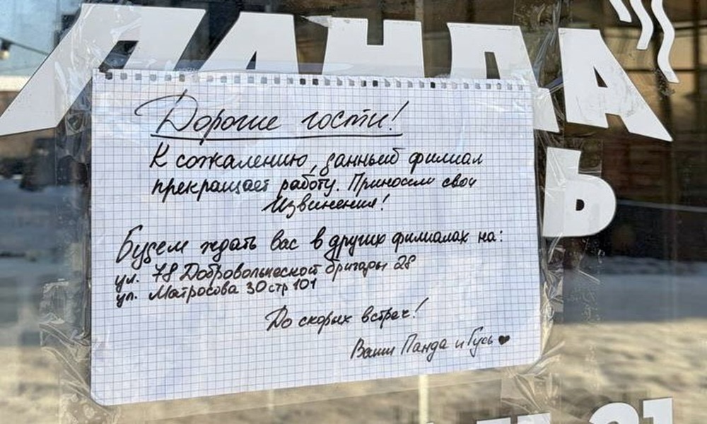 В Красноярске на Свободном закрылась лапшичная «Панда и гусь». Новостью поделились в телеграм-канале «Бал дебютанток». Объявление о закрытии появилось на дверях кафе. В нём сказано, что в городе продолжают работать две другие лапшичные «Панда и гусь» — на Матросова и на Взлётке. Владелец сети лапшичных Евгений Пономарёв рассказал «Проспекту Мира», что закрыл филиал из-за падения рынка. Напомним, «Панда и гусь» в парке Гагарина открылась в 2021 году. Под кафе возвели отдельное здание площадью 220 квадратов. Там было представлено сразу несколько форматов — кофейня, суши-бар, лапшичная. Ранее «Город Прима» рассказывал, что в Красноярске закрылся греческий гриль-бар Gyros Pub, который работал с апреля 2025 года, а также кафе Xianggang на Новосибирской. фото: t.me/baldebut.