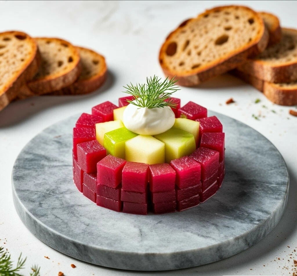 8. 🍽️ Подаём! Подавай закуску немедленно. Есть нужно, отламывая кусочек хрустящего хлебца и накладывая на него ложку тартара. Сочетание сладкой свеклы, кислого яблока, солёной сельди и острого хрена — это взрыв вкуса в изящной форме! 🎇