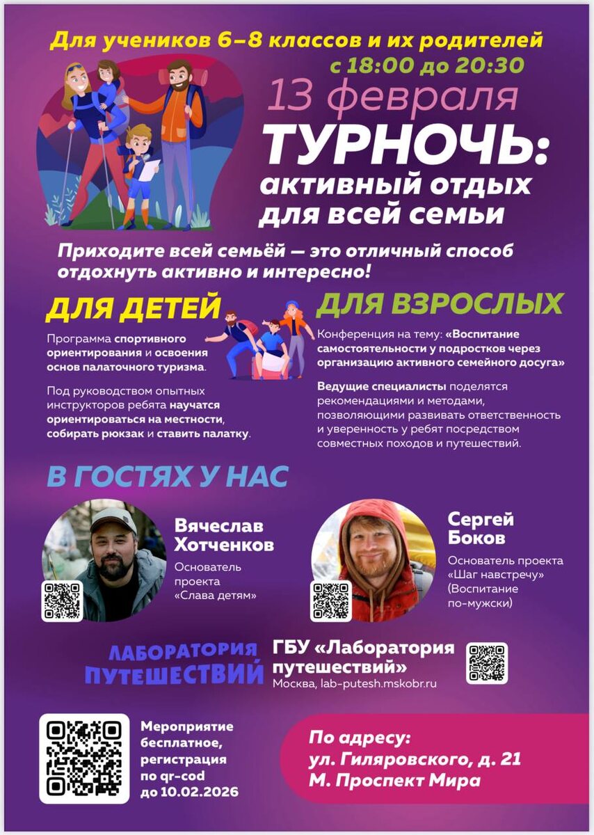 Называется оно #Турночь и посвящено активному отдыху для всей семьи. ⛺️ Для детей подготовлена увлекательная программа спортивного ориентирования и освоения основ палаточного туризма. Под руководством опытных инструкторов ребята научатся ориентироваться на местности, собирать рюкзак и ставить палатку. 🎤 Для взрослых будет организована конференция на важную тему воспитания самостоятельности у подростков через активный семейный досуг. Ведущие специалисты поделятся рекомендациями и методами, позволяющими развивать ответственность и уверенность у ребят посредством совместных походов и путешествий. В гостях у школы: 🗺 Вячеслав Хотченков, основатель проекта "Слава детям" (https://slavakids.ru/) 🗺 Сергей Боков, основатель проекта "Шаг навстречу" (https://vk.com/vospitaniepomyzhski) (Воспитание по-мужски) 🗺 ГБУ "Лаборатория путешествий", (https://lab-putesh.mskobr.ru/) Москва Приходите всей семьёй — это отличный способ отдохнуть активно и интересно! 👨👩👧👦 Мероприятие бесплатное