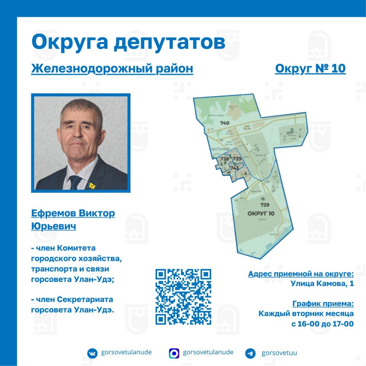 🔷️Избирательный округ №10 🔹️Округ №10 соседствует с округами №8 и 9 на северо-востоке Железнодорожного района Улан-Удэ. В состав округа входят территории поселка Восточный и несколько товариществ на границе с Заиграевским районом. Это уютный уголок и «сердце» Восточного, где улицы названы в честь известных инженеров-конструкторов и летчиков-испытателей. Здесь можно изучать историю самолето- и вертолетостроения, просто прогуливаясь по улицам. 🔹️Депутатом округа является Виктор Юрьевич Ефремов, член Комитета городского хозяйства, транспорта и связи Улан-Удэнского городского Совета депутатов. 🔹️Как и у округов №8 и 9, здесь актуальными остаются вопросы транспортной доступности и модернизации коммунального хозяйства. Не последним на повестке у жителей стоят вопросы озеленения придомовых территорий. 📍Адрес приемной на округе: Улица Камова, 1. 🗓График приема: Каждый вторник месяца с 16-00 до 17-00. 🔎 Подробнее о том, какие улицы и товарищества входят в границы округа №10 в наш