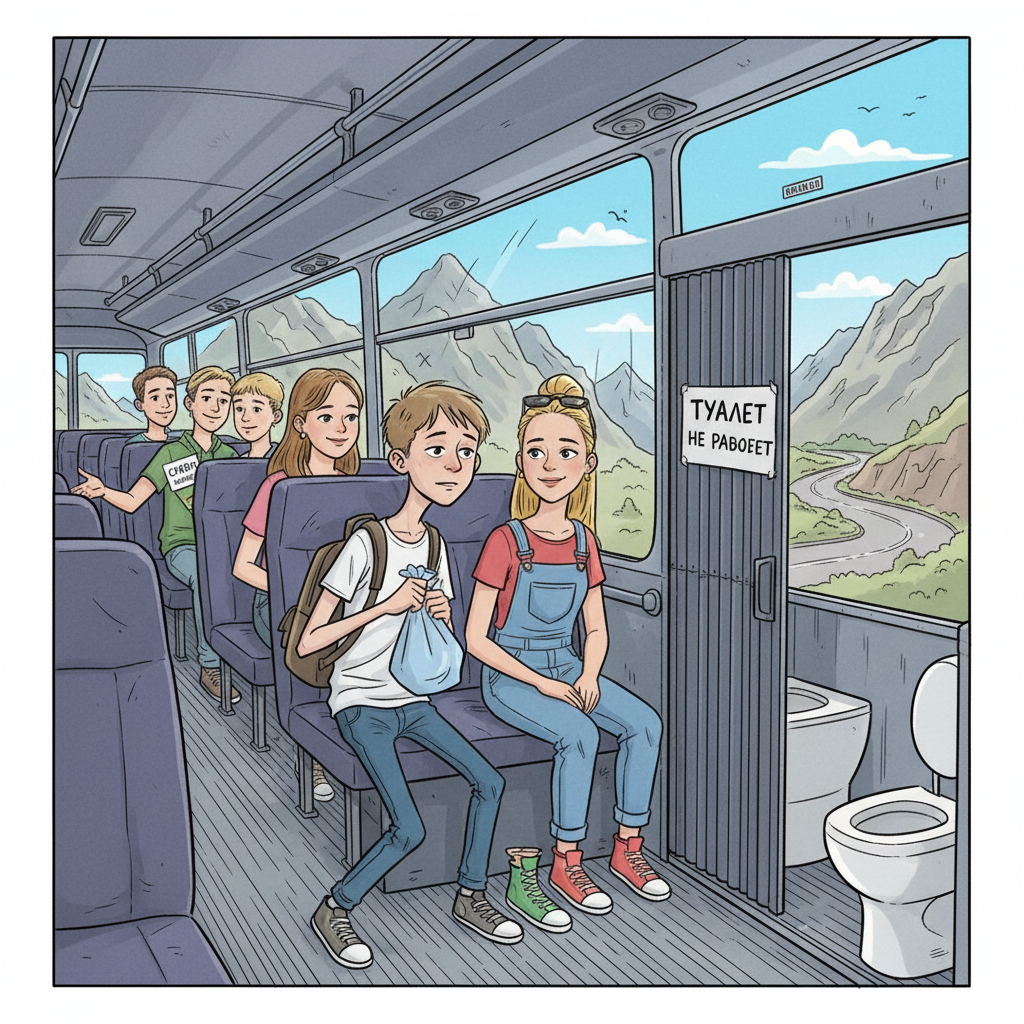 Самое обидное было даже не то, что укачивало. Обиднее было ощущение, что ты взрослый, почти мужчина, почти путешественник — а тебя крутит, как пакет в стиралке, и ты вынужден жить между двумя состояниями: «сейчас блевану» и «сейчас потерплю». В туалет толком не сходить, потому что автобус — это такая честная система: если тебе плохо, она не помогает, она фиксирует факт. Возле туалета, как назло, сидели две красивые девочки, ну относительно красивые! И я, как истинный герой своего же подросткового романа, носился между ними не потому, что хотел произвести впечатление, а потому что хотел выжить. Но со стороны, возможно, выглядело так, будто я выбираю судьбу, хрен там - в лагере были более взрослые парни и мне как всегда не везло с этим! Они просто подумали что у меня диарея!)))