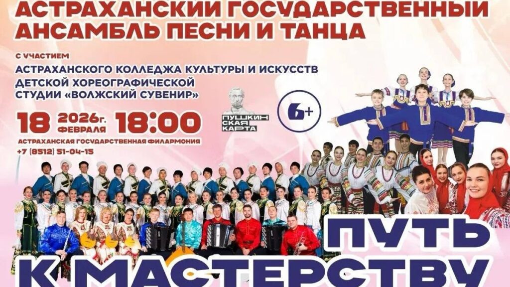 18 февраля в 18:00 в Концертном зале им. М. Максаковой Астраханской филармонии состоится концерт «Путь к мастерству». Зрителей ждёт яркое событие: на одной сцене соберутся артисты Астраханского государственного ансамбля песни и танца, учащиеся Астраханского колледжа культуры и искусств и воспитанники детской хореографической студии «Волжский сувенир», действующей при Ансамбле. Особой участницей концерта станет Александра Куницкая — ученица ведущей солистки Ансамбля, обладательницы гран‑при международных конкурсов Елены Марченко. Программа представит жемчужины репертуара Ансамбля. Зрители увидят калмыцкий и казахский танцы, насладятся исполнением знаменитой «Калинки», а также песен «Березничек вильеватый» и «Сыпь, тальянка». Учащиеся хореографического отделения колледжа подготовили для публики танец астраханских татар и задорную «Барыню». Воспитанники студии «Волжский сувенир» порадуют зрителей озорными танцами «Трещотки» и «Параня», примут участие в исполнении очаровательных «Матрешёк»