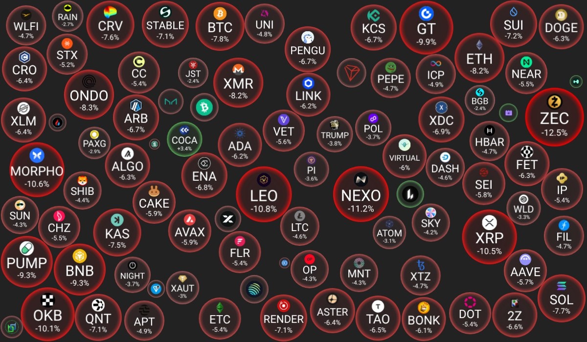 🗓 05.02.2026 09:30 по Москве. 🔗 Посмотреть на сайте 📈 Лидеры роста (из ТОП-100): 🟢 COCA (COCA): $1.2312 (+3.4%) 🟢 Lighter (LIT): $1.5438 (+1.9%) 🟢 MemeCore (M): $1.4963 (+0.7%) 📉 Лидеры падения (из ТОП-100): 🔴 Zcash (ZEC): $243 (-12.5%) 🔴 NEXO (NEXO): $0.7189 (-11.2%) 🔴 LEO Token (LEO): $7.8994 (-10.8%) 🔍 Основные метрики: 🔴 Общая капитализация: $2402.29 млрд (-7.03%) 🟢 Общий объем торгов: $189.65 млрд (+13.11%) 🔴 Доминация Bitcoin: 58.52% (-0.56%) 🔴 Доминация Ethereum: 10.44% (-0.15%) 🔴 Индекс страха и жадности: 12 / 100: ЭКСТРЕМАЛЬНЫЙ СТРАХ (-2) 🔴 Индекс Альтсезона: 33 / 100: НЕ АЛЬТКОИН-СЕЗОН (-1) 📖 Интересно почитать: 👉 Скрытые индикаторы крипторынка: метрики, которые помогут опередить толпу 😻 Наши сервисы и бонусы: 👥 VK - наша группа в VK 📈 Binance - 20% кешбэк на фьючерсах и 10% кешбек на споте.