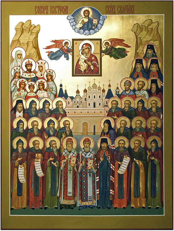 Собор святых Костромской митрополии. День памяти 5 февраля. Соборный праздник святых Костромской земли был установлен в 1981 году, по инициативе архиепископа Костромского и Галичского Кассиана (Ярославского) и по благословению патриарха Московского и всея Руси Пимена. Празднование было определено на 23 января – день памяти преподобного Геннадия Костромского. Поименный список Собора утвержден Священным Синодом Русской Православной Церкви 16 мая 2023 года (журнал № 31). Список Святых: Преподобный Авра́мий (Авраа́мий) Галичский, Чухломской, Городецкий, игумен. Преподобный Адриа́н Монзенский. Преподобный Алекса́ндр Вочский, Галичский. Страстотерпица Александра Романова, императрица Российская. Священномученик Алекси́й Великосельский, пресвитер. Страстотерпец Алекси́й Николаевич Романов, царевич. Страстотерпица Анастаси́я Николаевна Романова, великая княжна. Преподобномученик Афиноге́н, иеродиакон. Преподобномученик Варлаа́м, монах. Преподобный Варна́ва Ветлу́жский. Священномученик Влади́