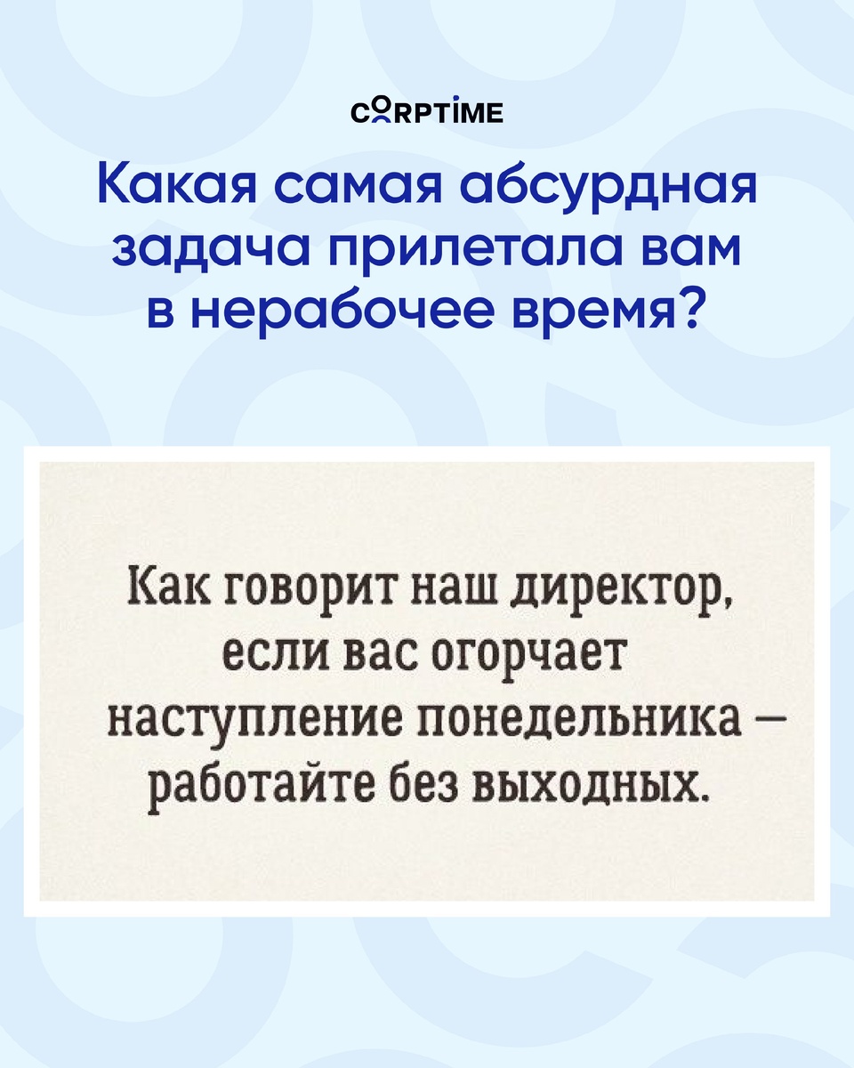 ? Не «срочно», а именно абсурдно. — «Посмотри, пожалуйста, когда будет время» в 23:47 — «Можешь быстро ответить?» в субботу — «Мы тут решили, ты в деле?» в воскресенье — «Напомни завтра, я сейчас не могу» — отправлено ночью Чаще всего проблема не в самих задачах. А в том, что у них нет границ. Когда нет разделения между рабочим и личным: задачи начинают прилетать не вовремя, но с ожиданием немедленной реакции. Ирония в том, что почти никто не делает это «из вредности». Просто нет понятного места и времени для запросов — и мессенджер становится универсальным контейнером для всего. Напишите в комментариях: какая задача стала для вас рекордной по абсурдности? Без имен и компаний — только ситуации.