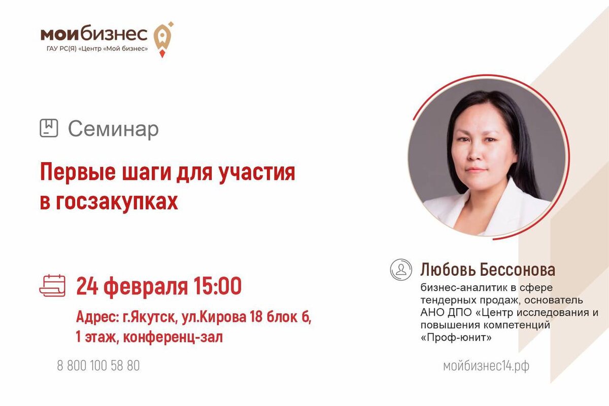 🚀 Центр «Мой бизнес» приглашает на очный семинар «Первые шаги для участия в госзакупках» Вы узнаете о необходимых инструментах для успешного старта в госзакупках. Спикер поделится ценными рекомендациями и расскажет о том, что нужно знать начинающим поставщикам государственных контрактов. 🌟 Программа: Почему нужно участвовать в госзакупках? Законодательство о контрактной системе РФ. Участники закупочного процесса. Алгоритм участия в закупке для поставщика. 📆 Дата: 24 февраля ⏰ Время: 15:00 🎙 Спикер: Любовь Бессонова, основатель АНО ДПО «Центр "Проф-Юнит"», бизнес-аналитик в сфере тендерных продаж, автор Практикума «Тендерный специалист», победитель конкурса Грантов Главы Якутии 📍 Адрес: г. Якутск, ул. Кирова 18, блок Б, 1 этаж, конференц-зал. 🔗 Ссылка для регистрации: https://forms.yandex.ru/u/6983f8d0e010db080890ab2a 📲Напоминаем, что канал Центра "Мой бизнес" запущен в МАХе. Подпишитесь, чтобы оставаться в курсе последних новостей! @moibizsakha