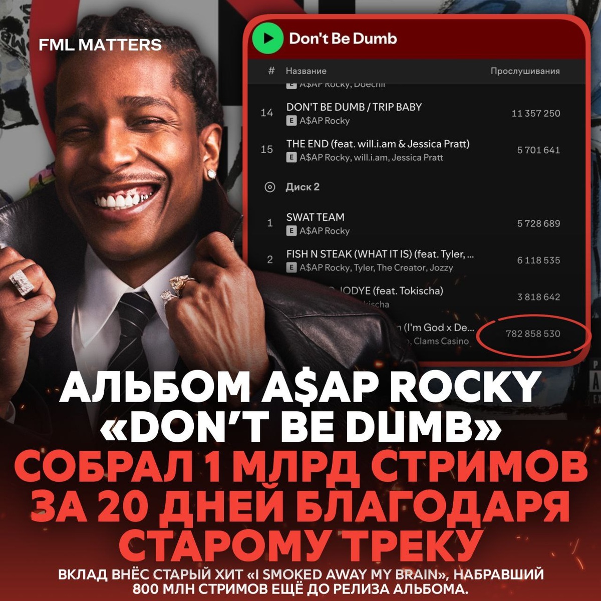 🤨 АЛЬБОМ A$AP ROCKY «DON’T BE DUMB» СОБРАЛ 1 МЛРД СТРИМОВ ЗА 3 НЕДЕЛИ, НО ЕСТЬ НЮАНС! Альбом рэпера «DON’T BE DUMB» установил рекорд, набрав 1 миллиард прослушиваний на стриминговых платформах всего за 20 дней с момента релиза. Однако секрет такого стремительного успеха кроется в одном из треков альбома. «I Smoked Away My Brain», который уже давно был доступен на платформах, к моменту выхода пластинки уже имел около 800 миллионов прослушиваний. Норм мув? ❤️🔥 / 👎 💀 FML MATTERS