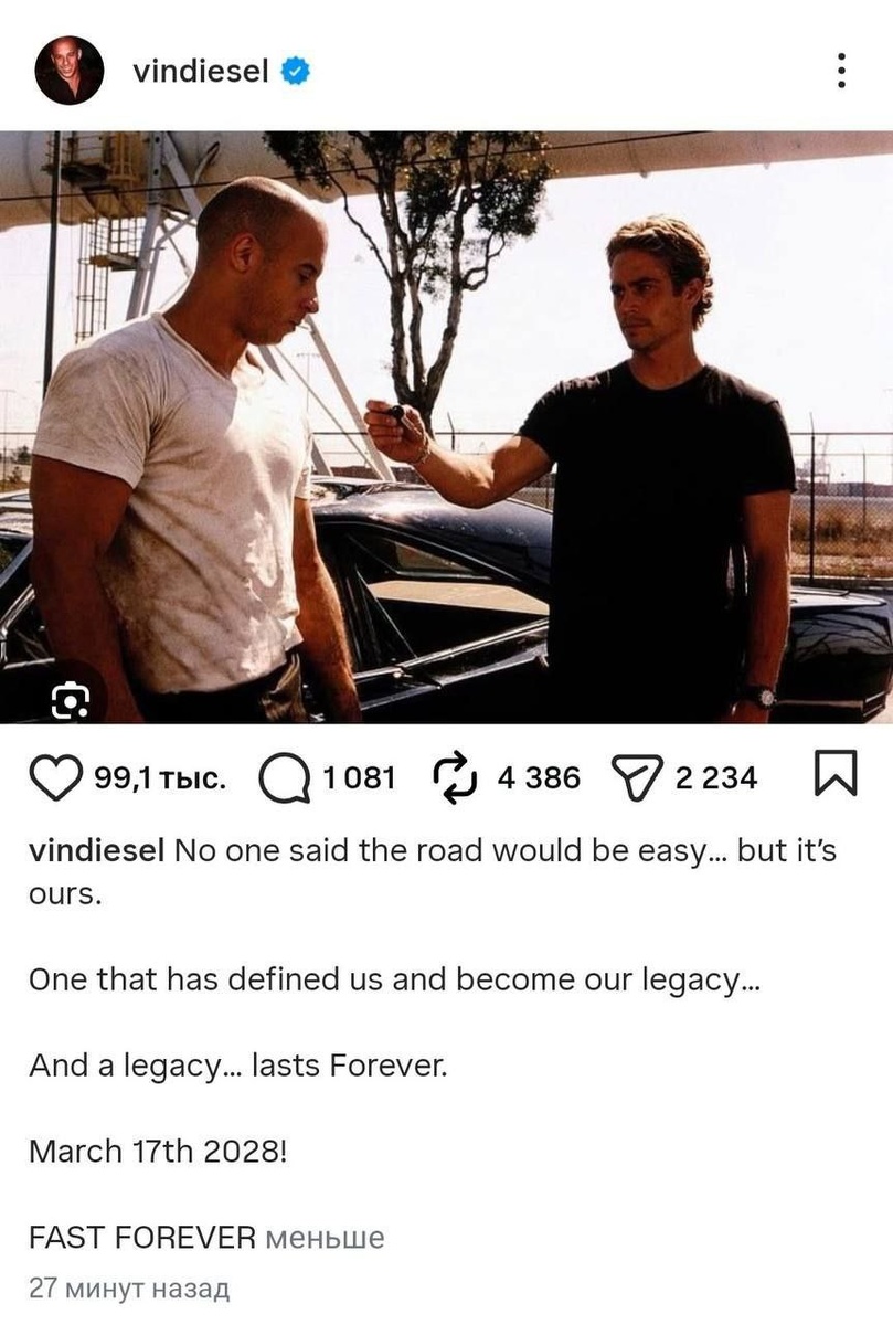 Эпоха, начавшаяся в 2001 году с простых уличных гонок в Лос-Анджелесе, подходит к концу. Вин Дизель выложил в соцсетях трогательный пост с Полом Уокером и анонсировал название одиннадцатой (и заключительной) части франшизы — «Fast Forever» («Форсаж навсегда»).