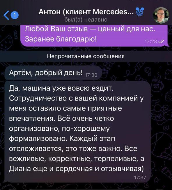 Поделился Антон, наш клиент из Костромы, после того как мы привезли ему Mercedes-Benz GLB прямиком из Китая. Ценим каждое слово его отзыва, особенно про нашу команду🙏🏻 Мы работаем для того, чтобы вы: ✔️ Не теряли нервов на таможне и логистике. ✔️ Видели каждый шаг от погрузки в Китае до выдачи в вашем городе. ✔️ Получили полную поддержку — не только профессиональную, но и человеческую. От всей души благодарим Антона за тёплые слова и желаем миллион километров без поломок! Хотите такую же ясность и надёжность при поставке вашего авто? Напишите нам в личные сообщения (https://t.me/Importexpro) или задайте вопрос в комментариях🤝 #отзывы_клиентов ❓ Связаться с нами / заказать авто: 📞 +79669993021 Доставка по всей России.