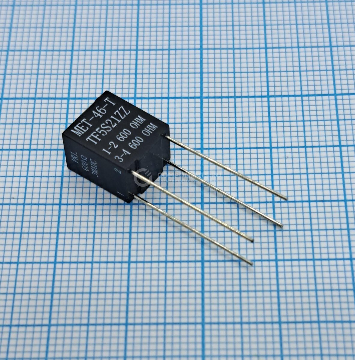 MET‑46‑T — миниатюрный герметизированный аудиотрансформатор производства Triad Magnetics (США). Предназначен для согласования и передачи аудиосигналов в цепях с импедансом 600 Ом. 1. Импеданс: - первичная обмотка — 600 Ом; - вторичная обмотка — 600 Ом. 2. Соотношение витков: 1 : 1. 3. Диапазон частот: 300 Гц – 3,5 кГц (неравномерность ±1 дБ). 4. Максимальная мощность: 50 мВт. 5. Сопротивление постоянному току: - первичная обмотка — 85 Ом; - вторичная обмотка — 110 Ом. Типовые области применения: телефония и голосовые линии (data/voice coupling); аудиоаппаратура; системы связи и передачи аналоговых сигналов; согласование импедансов в аудиоцепях; изоляция сигнальных цепей в телекоммуникационном оборудовании. 1. Универсальность: подходит для широкого спектра аудиоприменений. 2. Надёжность: протестирован на высокие напряжения и экстремальные температуры. 3. Удобство монтажа: продуманная конструкция выводов и корпуса. 4. Экологичность: соответствие современным экологическим стандартам (RoHS