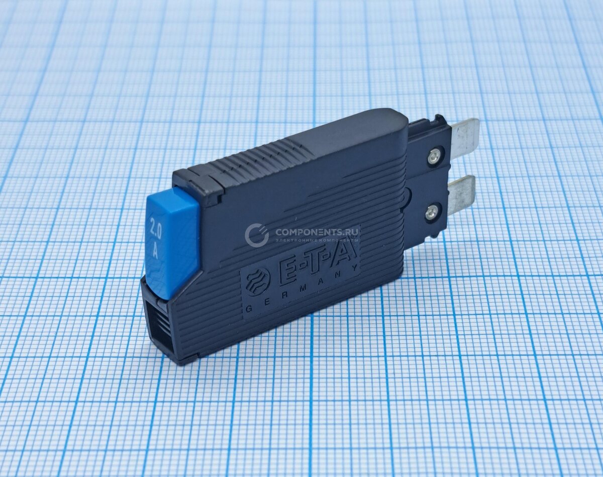 Тепловой автоматический выключатель 1180-01-2A производства E-T-A (ETA) — это миниатюрное однополюсное устройство, предназначенное для защиты электрических цепей от перегрузок и коротких замыканий. Он обеспечивает тепловую защиту и имеет опциональную функцию переключения (push-push). 1. Номинальный ток: 2 А. 2. Номинальное напряжение: - переменный ток (AC): 250 В; - постоянный ток (DC): 65 В. 3. Количество полюсов: 1. 4. Серия: 1180. 5. Габаритные размеры: 24,4 х 48,8 х 24,4 мм. 6. Механизм срабатывания: независимый от управляющего воздействия, с мгновенным срабатыванием. 7. Температурный диапазон эксплуатации: от -20 °C до +60 °C. Отключающая способность: - 250 В AC — 2000 А; - 60 В DC — 200 А. Клеммы в виде плоских штырей предназначены для установки в колодки для монтажа на рейку. Устройство соответствует стандартам EN/IEC 60934 (CBE), CSA, UL, VDE. При групповом монтаже нескольких устройств в одном гнезде рекомендуется снижать номинальную нагрузку каждого выключателя до 80% от его н
