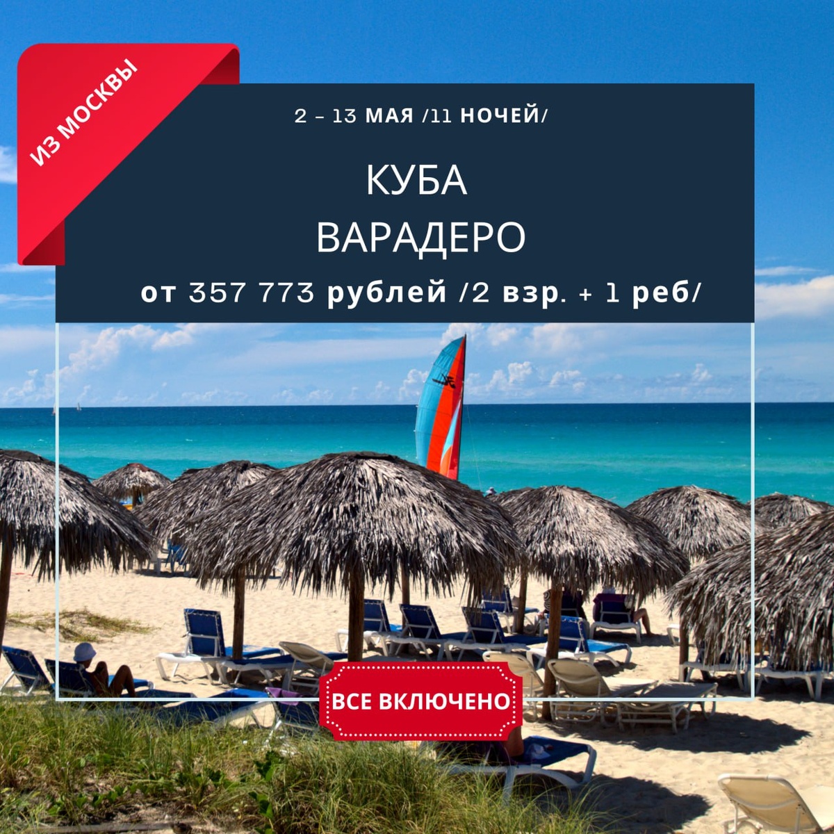 + 1 реб.). От 357 773 рублей. Вылет из Москвы — 2 мая /11 ночей/. Цены указаны за полный пакет (перелет, трансфер, страховка, проживание) и актуальны на момент публикации. Отели с высоким рейтингом. Быстрое подтверждение как номеров, так и билетов. Питание: Все включено. • Grand Memories Varadero 5⭐️ — 357 773 ₽ • Bella Costa 4⭐️ — 365 381 ₽ • Playa Vista Azul 5⭐️ — 377 895 ₽ • Iberostar Tainos 4⭐️ — 383 527 ₽ • Sol Caribe Beach 4⭐️ — 400 420 ₽ • Sol Palmeras 4⭐️ — 407 929 ₽ • Melia Varadero 5⭐️ — 416 063 ₽ • Melia Internacional 5⭐️ — 442 968 ₽ • Iberostar Selection Varadero 5⭐️ — 493 650 ₽ В пакет тура входит: ✈️ Перелет АК "Северный ветер" - 10 кг. багажа + 10 кг. ручная кладь на человека (габариты 55 x 40 x 20 см) 🛡Страхование EUROINS "Полное покрытие + Невыезд 1000" (Куба) 🚐 Групповой трансфер Проживание (Все включено) 📲 Оплата производится безналичным расчетом. Вы получите полный пакет документов, подтверждающий законность сделки и защищающий ваши права как туриста