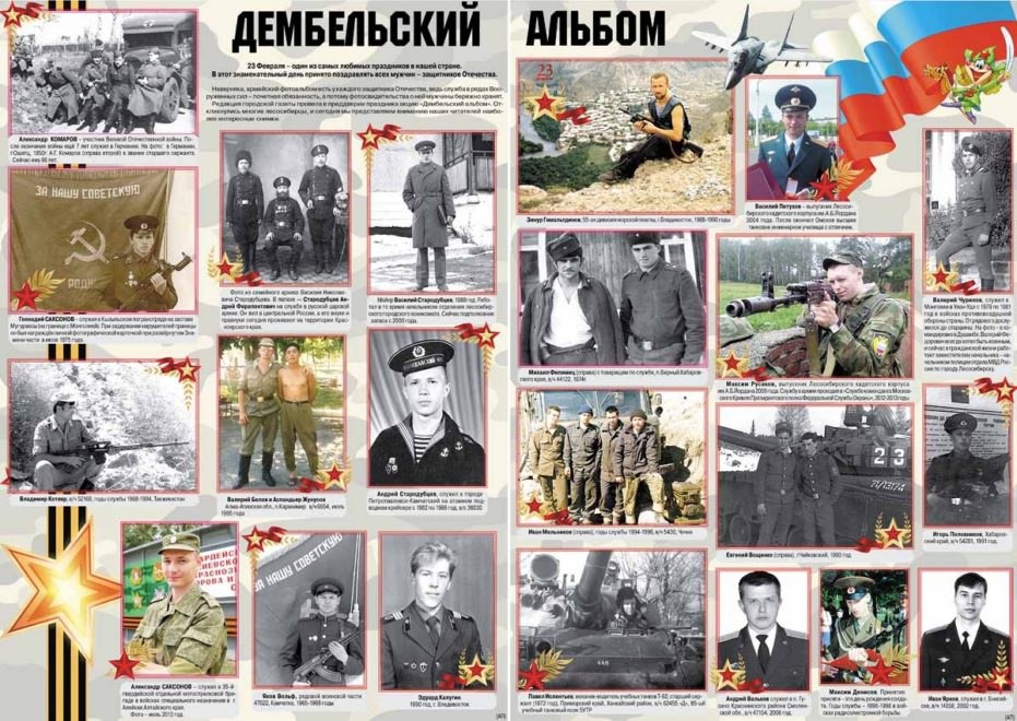 Дорогие друзья! В преддверии Дня защитника Отечества газета «Енисейская правда» объявляет акцию «Дембельский альбом» В акции могут принять участие все желающие, независимо от того, когда вам довелось служить – совсем недавно или во времена СССР, кто создавал собственный дембельский альбом, сохранил армейские фотоснимки. Приглашаем к участию и тех, кто сохранил альбомы, фотографии своих родственников, дедов и прадедов. Как стать участником акции? Возьмите снимок из дембельского альбома, назовите, кто запечатлен на снимке, укажите в какие годы, где, в каких войсках проходила служба. Принесите фото в редакцию газеты по адресу: г. Лесосибирск, ул. Победы, 1г или г. Енисейск, пер. Партизанский, 11. Отправьте фото в наши группы «Енисейская правда» или «Заря Енисея» в ВКонтакте. Интересная армейская история не обязательна, но приветствуется. Участвуйте в акции! Поделитесь памятью о своих армейских буднях! Мы ждем фото до 15 февраля включительно. Поступившие в редакцию снимки будут опубл
