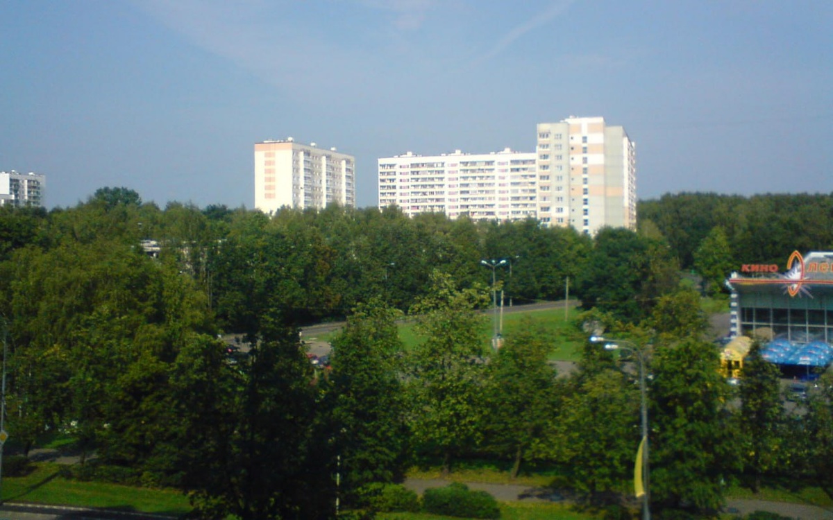 Вид на кинотеатр «Электрон» и дома 1-го микрорайона, 2007 год. Фото Perituss с сайта commons.wikimedia.org
