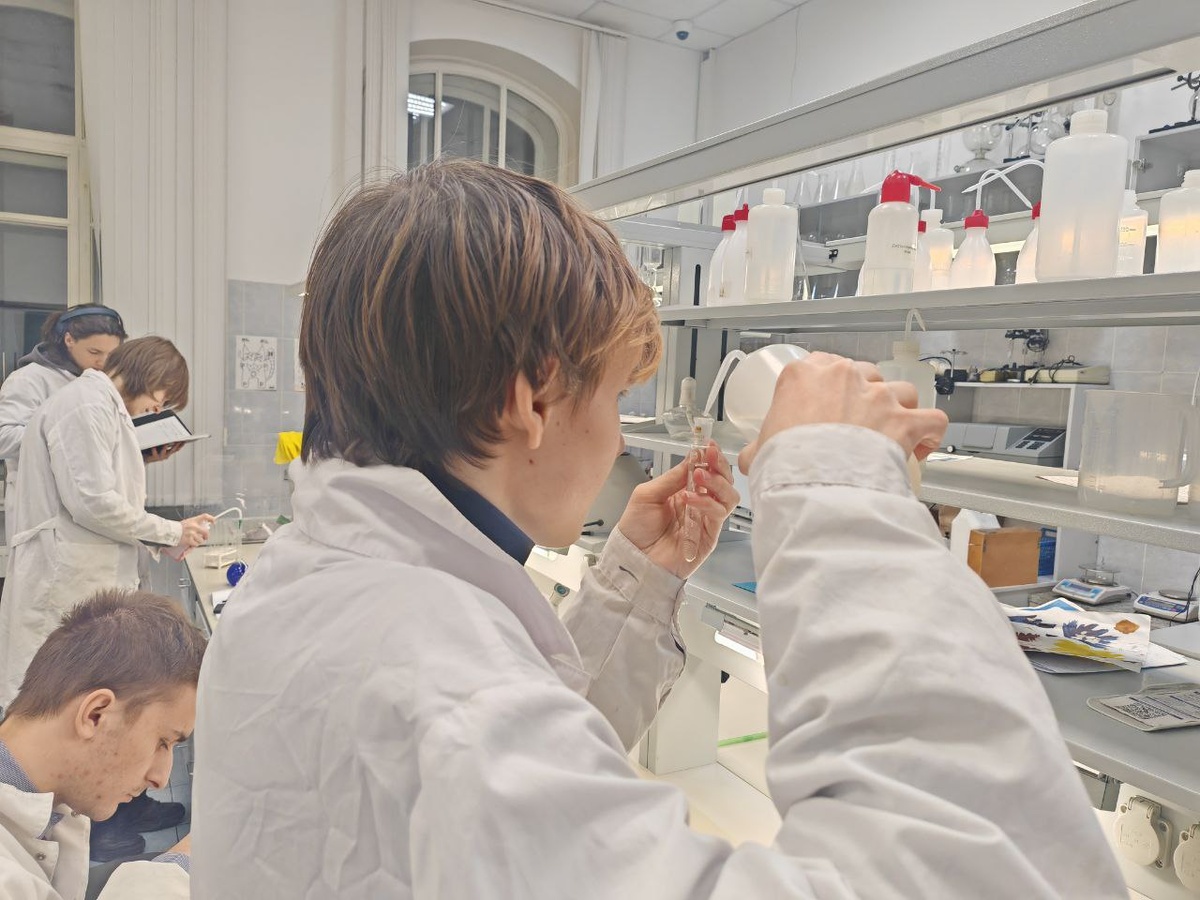 Вчера в рамках обучения профессии Лаборант химического анализа вел занятие по визуальной колориметрии. Если по-человечески: определяли концентрацию по цвету раствора красителя. Человеческий глаз, если относиться к нему бережно, очень точный прибор, примерно как фотометр начального уровня. Главное, понимать, что мы можем хорошо, а что-плохо. При хорошем освещении мы отлично сравниваем цвет и его интенсивность в двух растворах, держа их рядом. Еще полезно для более точного сравнения менять их в руках местами и смотреть по очереди то одним, то другим глазом. При этом если бы нам дать задачу: "Посмотри на этот раствор, запомни его, а через секунду - на тот", - то ничего хорошего, если вы не профессиональный художник, из этого не выйдет. Аналогично будет проблема при плохом освещении, в разной посуде, в тонком слое и пр. Поэтому если хотите использовать свой глаз для определения концентрации, нужно сделать следующее. 1) Приготовить серию окрашеных растворов с разной концентрацией - шк