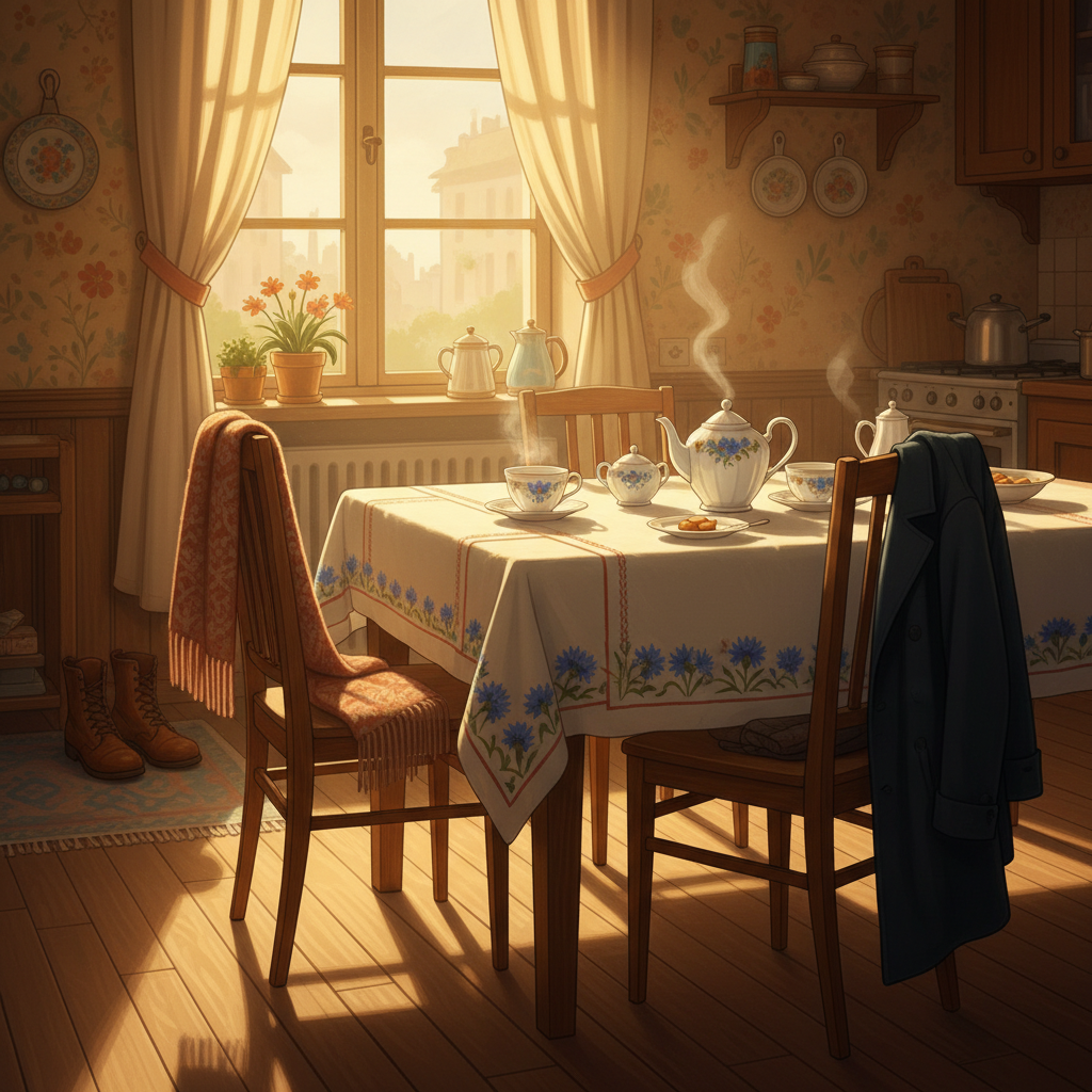 В тот же момент чашки едва заметно звякнули — сами. Не соскользнули, не подпрыгнули, просто звякнули, будто кто-то провёл ложечкой по фарфору.