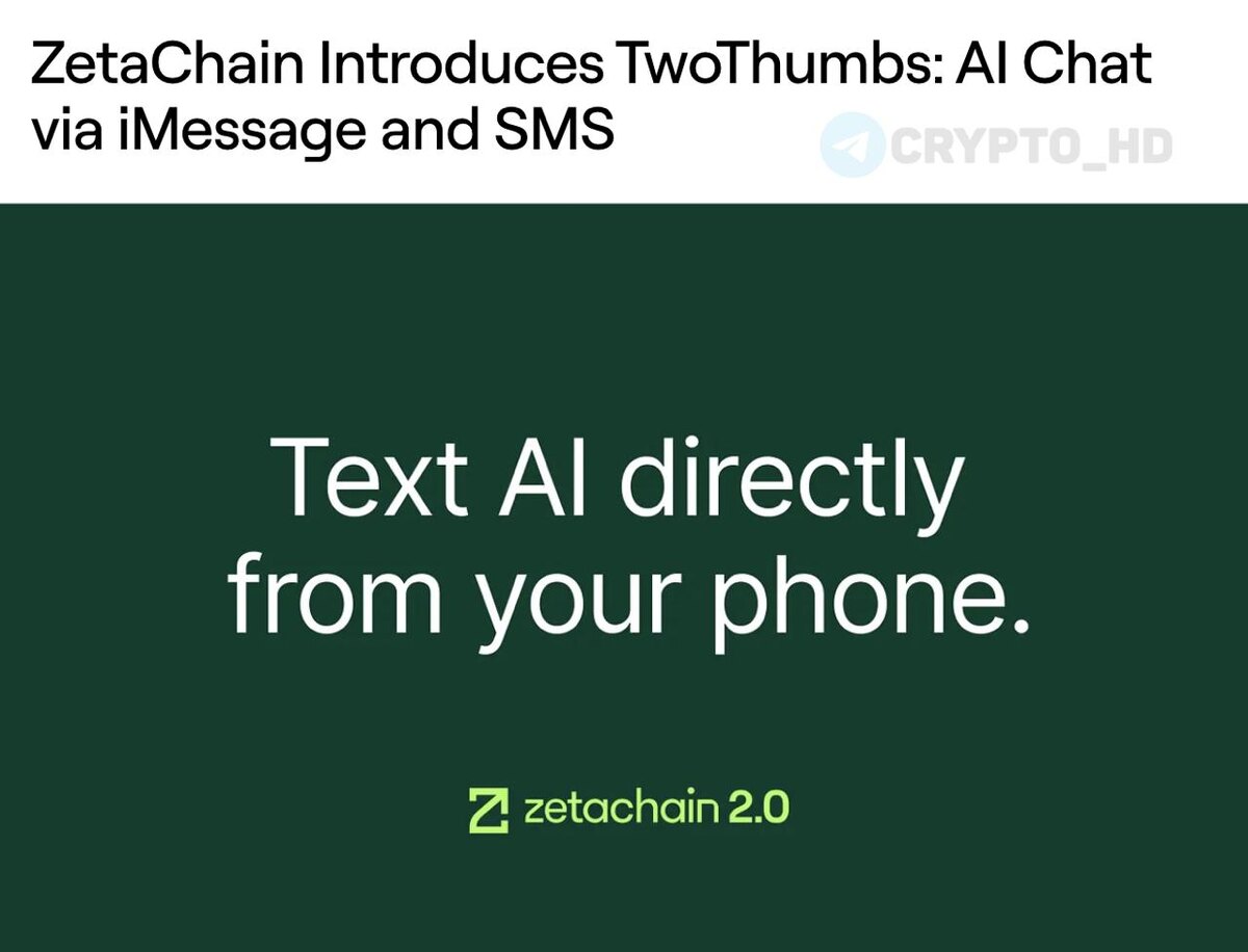 🤖 В ZetaChain запустили TwoThumbs — AI-чат через iMessage и SMS (релиз) Как это работает: • Сообщение можно отправлять AI-боту как обычному контакту в SMS или iMessage. • Есть возможность выбирать разных AI-персонажей, ассистентов и агентов. • Контекст диалога сохраняется со временем, а не обнуляется. • Можно переключать AI-модели без потери истории. • Подходит и для личных диалогов, и для групповых чатов. ZetaChain использует ту же логику, что и в блокчейнах — убрать фрагментацию, сохранить приватную память и дать переносимость между моделями. Ранее: - партнерство с Alibaba Cloud - STC - ZetaChain в Дубае - Google Cloud Crypto Headlines