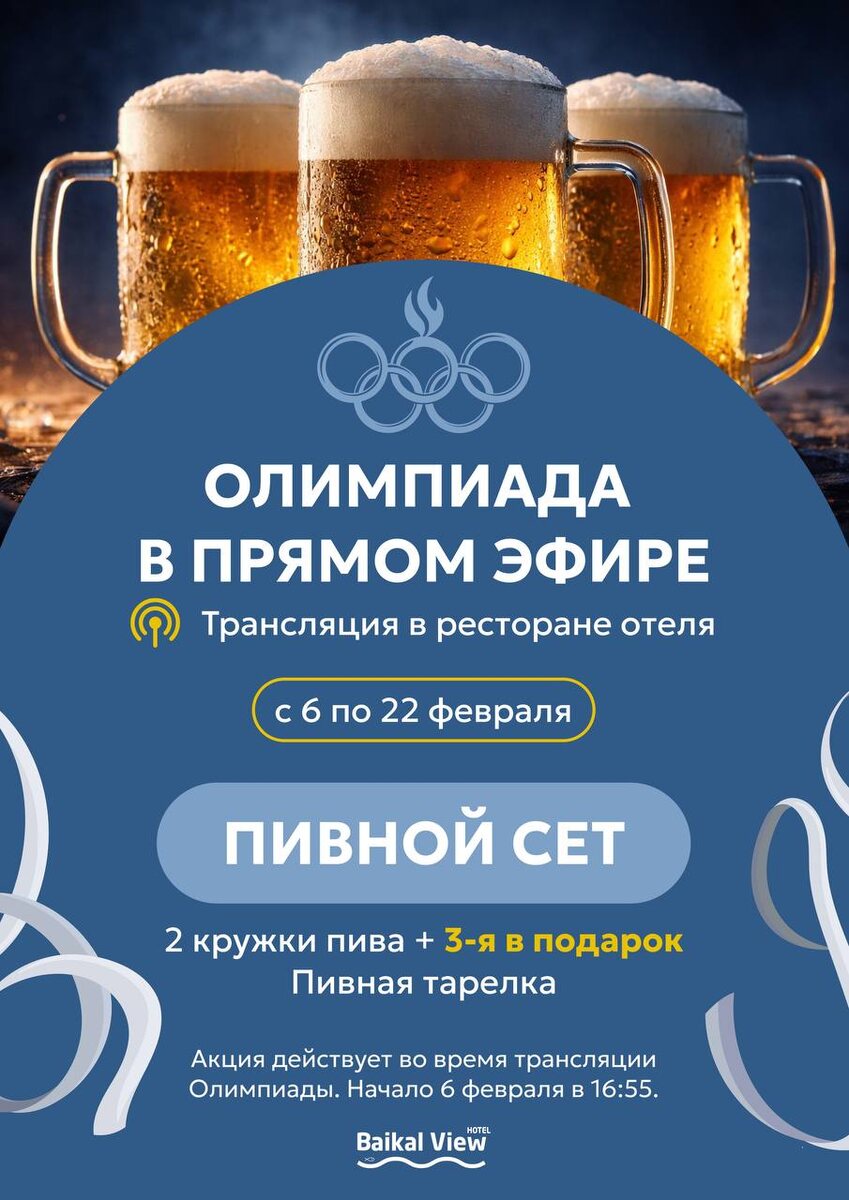ΡΠΎΡΠ΅Π²Π½ΠΎΠ²Π°Π½ΠΈΠΉ. Π ΡΠ΅ΡΡΡ ΡΡΠΎΠ³ΠΎ ΠΌΡ ΠΏΠΎΠ΄Π³ΠΎΡΠΎΠ²ΠΈΠ»ΠΈ ΡΠΏΠ΅ΡΠΈΠ°Π»ΡΠ½ΡΠΉ ΡΠ΅Ρ Β«ΠΠ»ΠΈΠΌΠΏΠΈΠΉΡΠΊΠΈΠΉΒ»: πΊ 2 ΠΊΡΡΠΆΠΊΠΈ ΠΏΠΈΠ²Π° + ΠΏΠΈΠ²Π½Π°Ρ ΡΠ°ΡΠ΅Π»ΠΊΠ° π 3-Ρ ΠΊΡΡΠΆΠΊΠ° ΠΏΠΈΠ²Π° β Π² ΠΏΠΎΠ΄Π°ΡΠΎΠΊ! ΠΠΎΠ»Π΅ΠΉΡΠ΅ Π·Π° ΡΠ΅ΠΌΠΏΠΈΠΎΠ½ΠΎΠ², Π½Π°ΡΠ»Π°ΠΆΠ΄Π°ΠΉΡΠ΅ΡΡ Π°ΡΠΌΠΎΡΡΠ΅ΡΠΎΠΉ ΠΈ Π²ΠΊΡΡΠΎΠΌ ΠΏΠΎΠ±Π΅Π΄ Π²ΠΌΠ΅ΡΡΠ΅ Ρ Baikal View!