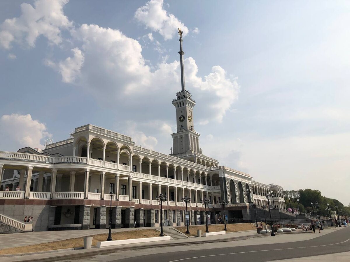 Северный речной вокзал Пристань с многочисленными причалами, само здание речного вокзала и парк, тянущийся до Ленинградского шоссе, являются одной из прекрасных жемчужин в ожерелье Северо-Запада Москвы. Состоит это ожерелье из водных ниток Москва-реки, речек Сходня и Химки, Химкинского водохранилища и Канала имени Москвы. Зимой Химкинское водохранилище замерзает и можно перейти с южного берега в Тушино на северный к великолепному речному вокзалу. В зимнее время он не украшен, стоящими у причалов теплоходами и катерами, но не менее красив, чем летом. Сделанный в форме корабля, он как бы гордо поднимает мачту в одиночестве над снежно-ледяным простором водохранилища. Северный речной вокзал Московского речного пароходства был построен в период с 1932 по 1937 года одновременно с Каналом имени Москвы на берегу Химкинского водохранилища ещё до его затопления. Над созданием объекта трудился большой коллектив: архитектор А.М. Рухлядев, скульптор И.С. Ефимов, художник Н.Я. Данько и другие. Как у