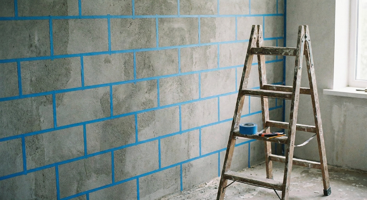 Это самый долгий и нудный этап, но от него зависит всё. Стену нужно загрунтовать. Затем мы имитируем швы будущей кладки с помощью скотча.