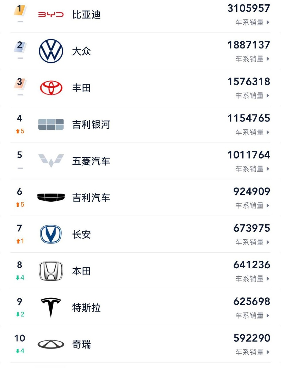 2025 В 2025 году в Китае было продано: ❗️34,4 миллиона легковых автомобилей. При этом около 20% из них (примерно 6,88 миллиона) были отправлены на экспорт. Некоторые ключевые тенденции и детали: 📌Производство автомобилей в Китае в 2025 году увеличилось на 9% по сравнению с 2024 годом. 📌Доля китайских брендов на внутреннем рынке превысила 65%, что стало рекордом. Для сравнения: в 2023 году их доля составляла около 56%. 📌На электромобили и гибриды (NEV) пришлось около 60% продаж легковых машин в 2025 году. Лидеры по продажам отдельных брендов в 2025 году: 1️⃣BYD — 3,1 миллиона автомобилей. Несмотря на лидерство, продажи компании снизились на 11,9% по сравнению с 2024 годом, а доля рынка сократилась с 15,3% до 12,99%. 2️⃣Volkswagen — 1,88 миллиона автомобилей. 3️⃣Toyota — 1,58 миллиона автомобилей. 4️⃣Geely (включая суббренд Geely Galaxy) — более 2,69 миллиона автомобилей (суммарно по всем направлениям группы: Geely, Galaxy, Lynk & Co и Zeekr). Среди популярных моделей